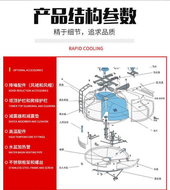 塔體、水槽及面板均采用具有良好耐腐蝕性能的FRP材質,并在膠衣樹脂中加有光穩定劑,具有良好的抗老化性能,經久不變色。塔體鋼結構件在加工后采用鍍鋅處理,提高冷卻塔的耐腐蝕性能,在正常使用壽命內,不需另外防腐。
